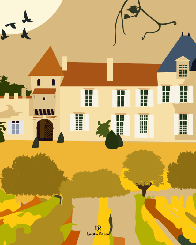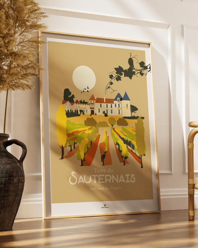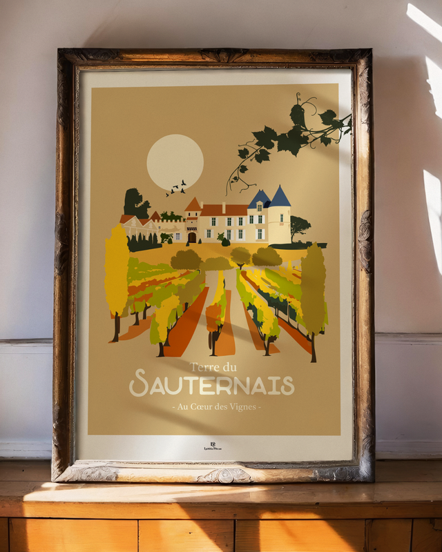 Plongez dans l’atmosphère paisible du vignoble girondin avec cette affiche Terres du Sauternais - Au Cœur des Vignes. Une illustration inspirée des paysages emblématiques du Sauternais, entre château et rangs de vignes, idéale pour une décoration élégante et chaleureuse.