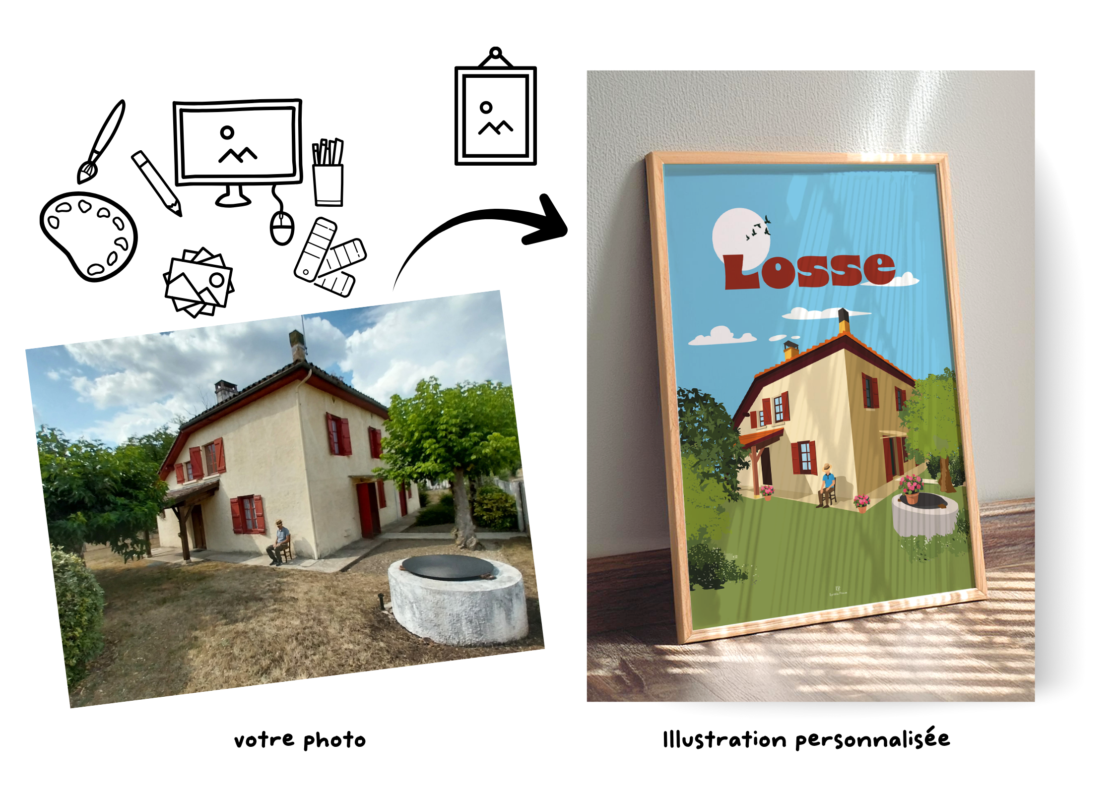 Que ce soit un lieu qui vous est cher, un souvenir de voyage ou un coin de Sud Gironde qui vous tient à cœur, je réalise pour vous une illustration personnalisée, dans l’esprit graphique de mes collections. Tous les tracés sont réalisés à la souris d’ordinateur, en vectoriel, pour un rendu précis et élégant.